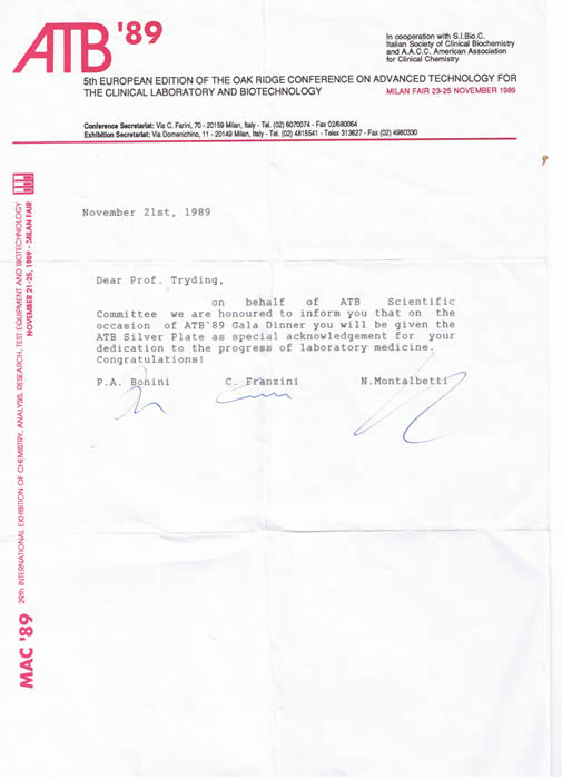 The Scientific Committee of the European Edition of the Oak Ridge Conference on advanced technology for the clinical laboratory and biotechnology ATB´89 awarded me the ATB Silver Plate for my dedication to the progress of laboratory medicine at a meeting in Milan.